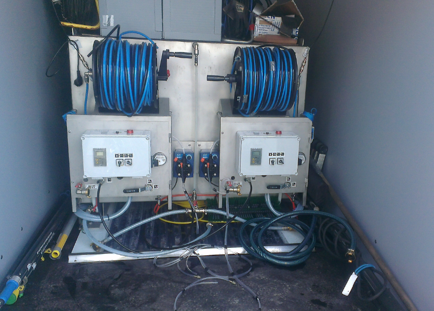 Zusätzlich zu unserem Spezial-Anhänger, haben wir noch einen kleineren Kofferanhänger, in dem wir bis zu drei mobile Reinigungsstationen samt zusätzlicher Ausrüstung unterbringen können. Entsprechende Technik zur Enthärtung des Wassers ist ebenfalls immer dabei.